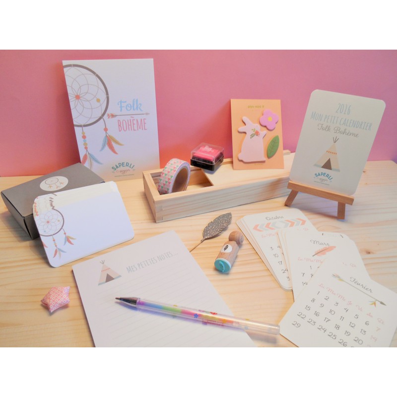 Le coffret Bohème Folk est de retour dans sa version 2017 ! Embarquez-vous pour l'imaginaire indien, avec cette box de papeterie. Ce coffret est rempli de produits aux couleurs douces : jolis tipis, attrape-rêves et motifs géométriques pour une année 2017 douce et organisée !
