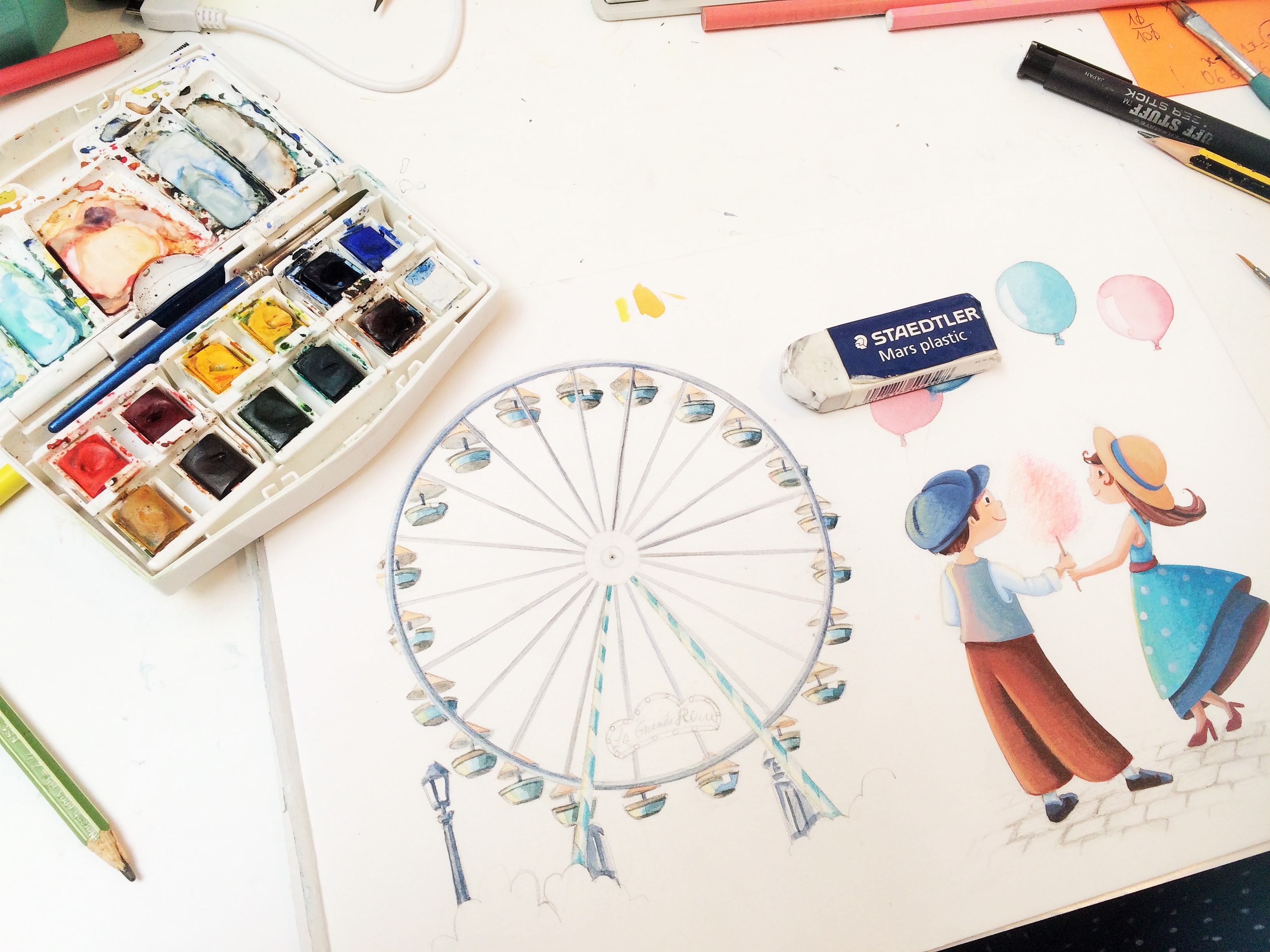 Pour la série des Ptits Parisiens j’ai fait un mix des deux : j’ai réalisé tous les décors à l’aquarelle et les personnages à l’acrylique, pour les mettre bien en avant et accentuer le contraste. J’ai beaucoup aimé mélanger les techniques et c’est quelque chose que je vais faire de plus en plus.